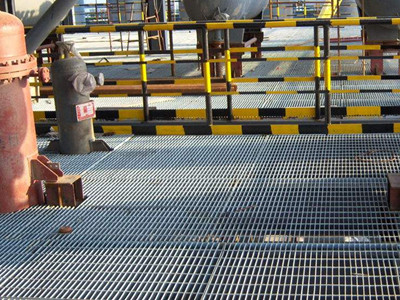 化工廠用鋼格板 鋼格板是用承載扁鋼和橫桿按照一定的間距進(jìn)行正交組合,通過焊接或壓鎖加以固定的開敞式鋼構(gòu)件;橫桿一般采用經(jīng)過扭絞的方鋼、也可采用圓鋼或扁鋼,材質(zhì)分為碳鋼和不銹鋼鋼格板主要用來做鋼結(jié)構(gòu)平臺板、溝蓋板、鋼梯的踏步板、建筑物吊頂?shù)取? 簡介 ···